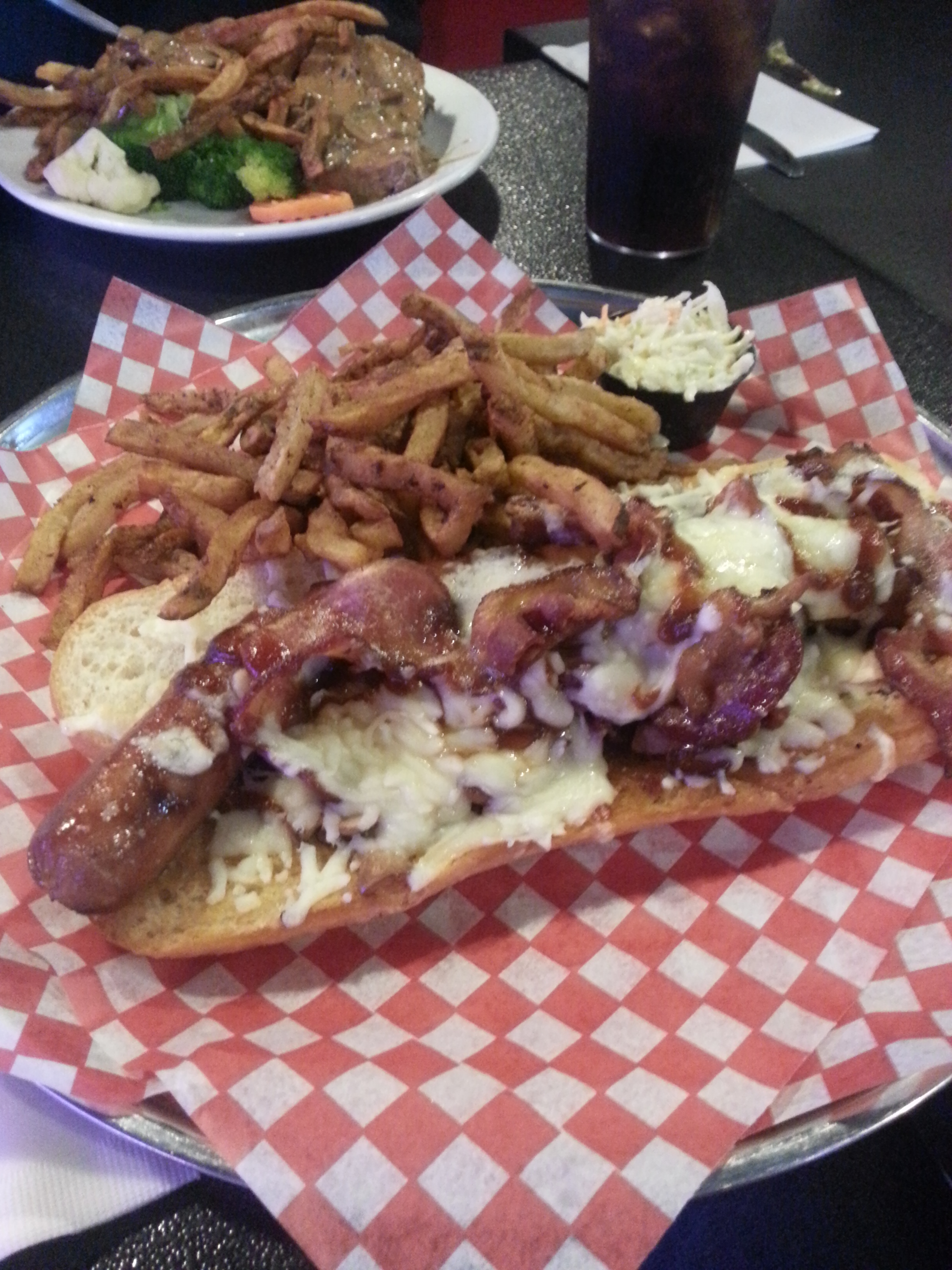 Well I didn;t take the advice I was thinknig about the footlong sub when I was out at the True North Diner in Bedford. We were there for Emily the intern’s final day at Eastlink. So it’s a fifty’s restaurant the waitresses wearing long skirts and tennis sneakers like the real deal. So I decide what the hell I’ll have this hot dog with cheese, bacon, bbq sauce, and mushrooms. The waitress asked “Do you want to make that a foot long?”